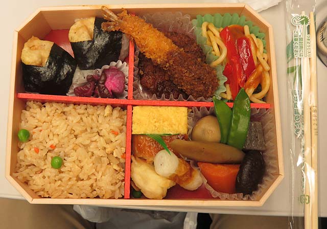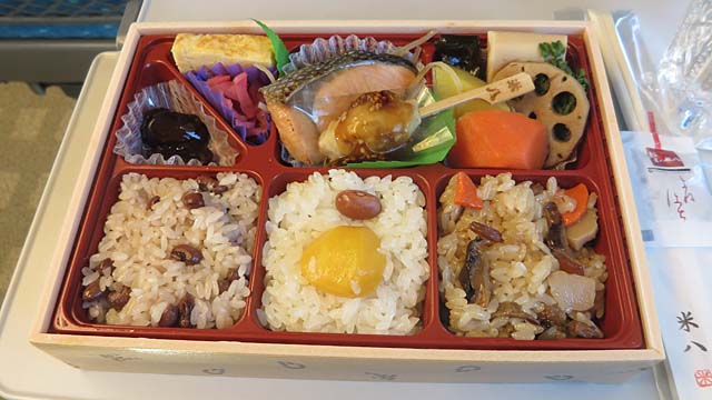 7時過ぎ、新横浜に着く前に用意してました。今回のお弁当は米八の幕の内です。