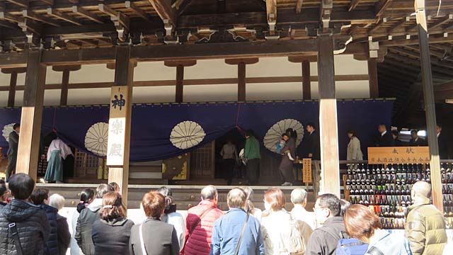 御神楽奉納のために待ちます。なにやら祈祷の人たちと一緒のようです。御神楽の奉納だけというのは無くてツアー会社が祈祷してもらうのに同席してもらうという形なのかもしれません。この時点で15時ちょっと前、祈祷、御神楽奉納は約30分ほどでした。