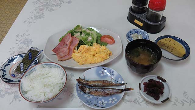 ごく普通の献立です。もちろん十分です。ただね、焼き魚(ししゃも?)と焼きベーコンが冷たかった。冷めたベーコンの油はいただけません (--; これだけが残念。