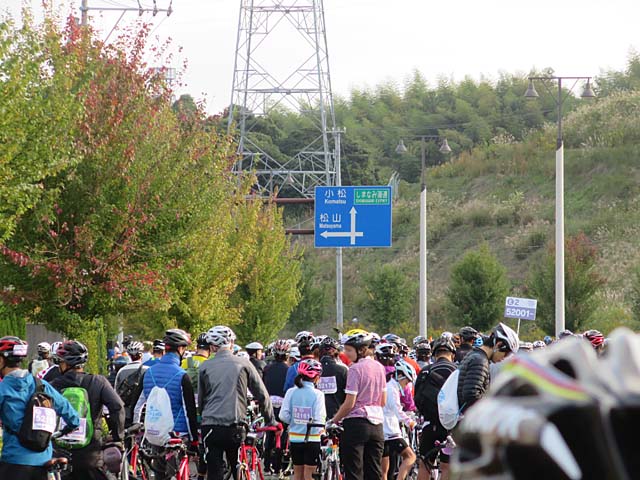 今治ICから入るのでしまなみ海道の自転車コースとは反対に南の方へ向かいます。誘導がいるので迷うことはありません。もう整列が始まっている。