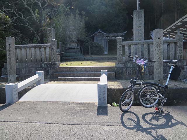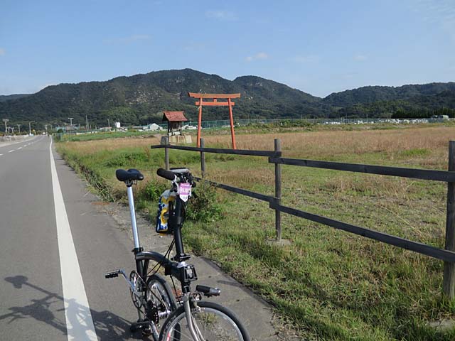 大島に下りて満喫しながら走ります。吹きさらしにぽつりとある広大な空地の隅に小さな鳥居と祠。簡易的にお参りさせていただいてパチリ