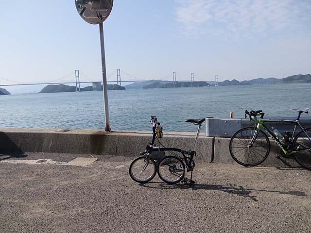 来島海峡大橋を渡って戻ります。さっきはあっち(自動車道)を走ったんだなぁと思いながら景色も楽しみ走ります。もちろん安全確保した上ですよ。