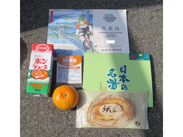 ゴール後、駐輪ラックにライト君を停めチップの返還。完走証と記念品を受け取ります。