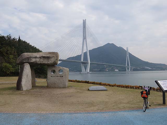 サイクリストの聖地。2014年に台湾のサイクリングコースとの姉妹自転車道協定を締結したことと、「サイクリングしまなみ」が開催されたこと記念して制定されたそうです。多々羅大橋を背景に。