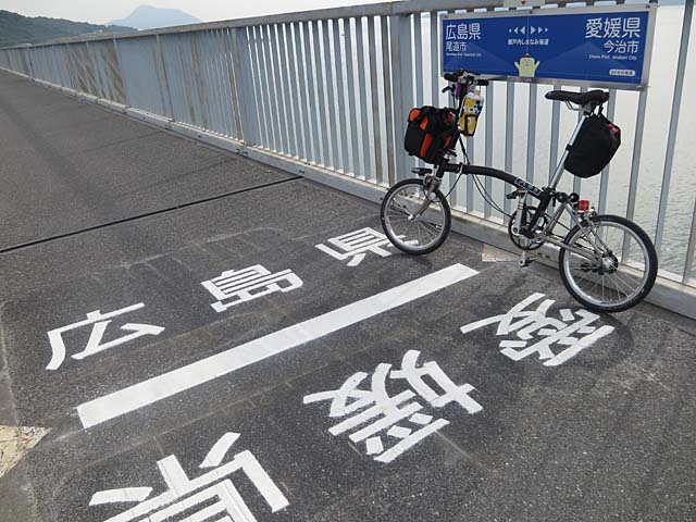 多々羅大橋中央?にある県境。愛媛県に別れを告げて広島県へ入ります。