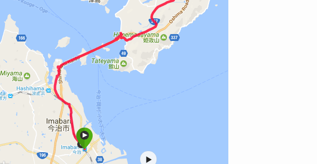 今治駅から大島に入ったところまでの標高。山の部分が来島海峡大橋です。