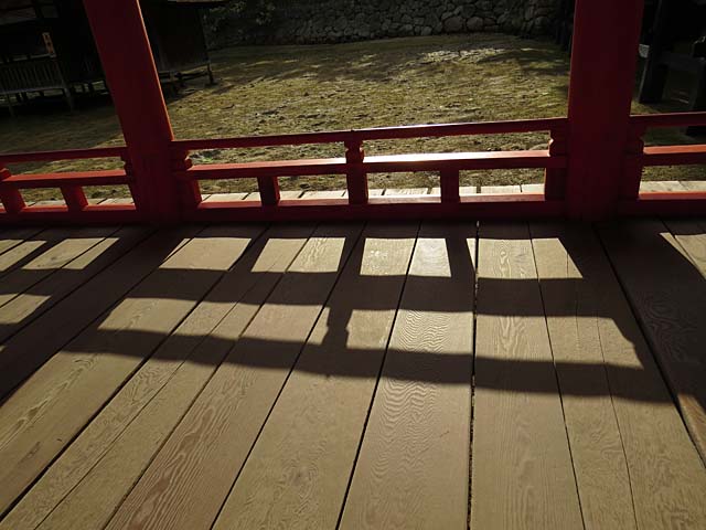 回廊の床板。水の力を逃がすための隙間。