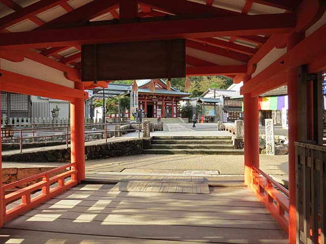 西回廊から見た平舞台越しの大鳥居。