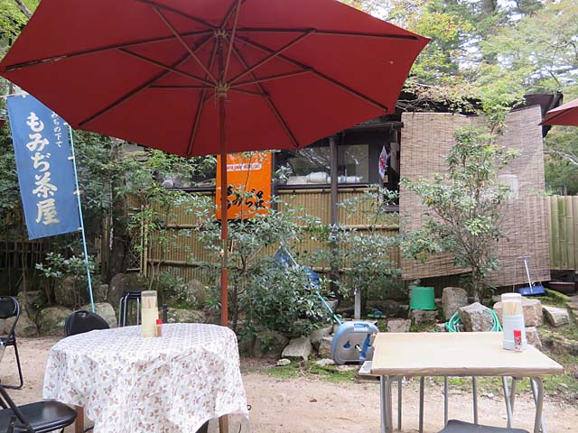 時間的に商店街の方では混んでいるだろうなぁ。紅葉谷公園のところに一軒の茶店が。表で食べます。まだ貸し切り状態なので客寄せパンダです(^^ゞ