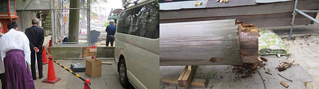 平成32年は本殿が創建されて1370年、改修工事が進められていました。二の鳥居の交換作業中。