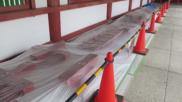 金堂が改修工事中。取り外された部品が並べられています。間近で見られるのもこういう時期だからで貴重な体験です。