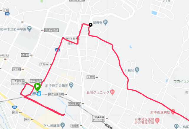 下の折り返しているところがはじまりの広場、黒丸が小野神社内、惣社です。