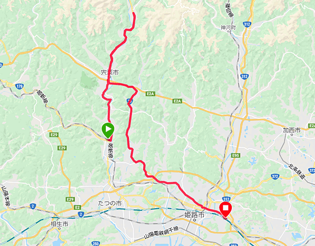 播磨新宮駅まで戻りそこから姫路駅まで輪行すれば今日中に播磨国が終えられる。せっせと下っていきます。そう、せっせと走ったおかげで中国自動車道の山崎ICの所を道なり左カーブに行ってしまった。駅に向かうならここで南下しなければ。一山超えたところで気づくも戻る気力はない。このまま29号線(因幡街道)で姫路駅方面へ向かってしまいましょう。途中、歩道が広く取られた整備されたところを走ります。これだけ広ければ安心して走れるので歩道へあがろうとしたら... やってしまった。入射角が浅かったんですねすっころびましたよ。しかも両掌、左ひざと打撲&擦り傷。ハンドルを握るのも痛い状況。まずは最初にあったコンビニで2リットルの水とエネルギー補給。洗浄してペースを落として姫路駅に向かいます。姫路城が見えてきました。次の目的地は姫路城隣接です。