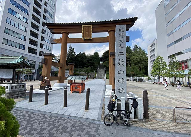 次は総社宮へ向かいます。が、雨が落ちてきました。予報よりかなり早い振りだしです。雨具が必要なレベル。ポンチョをかぶります。多賀城跡隣接なので近いながら結構な登りです。この半年間ほとんど走っていないのできついです(^^;