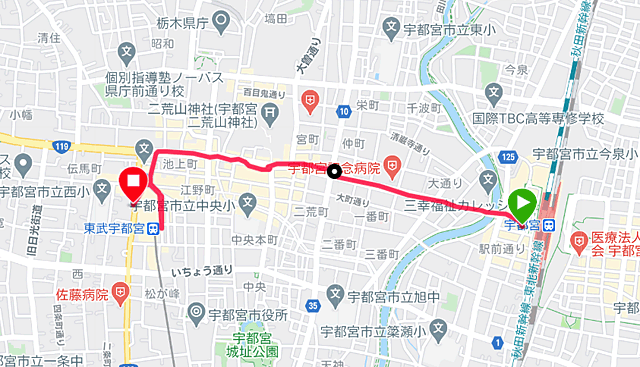 下野国巡りの中心地は栃木駅付近。なのでJR宇都宮駅から東武宇都宮駅へ移動します。その通り道に一宮があります。こちらの一宮を見送るなら新幹線で小金井駅まで行ってしまう手もありました。