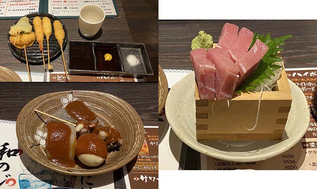 串カツ盛合わせ、おでん盛合せ、まぐろの刺身。和歌山風で小さいサイズを。色々食べたかったので(*^^*)