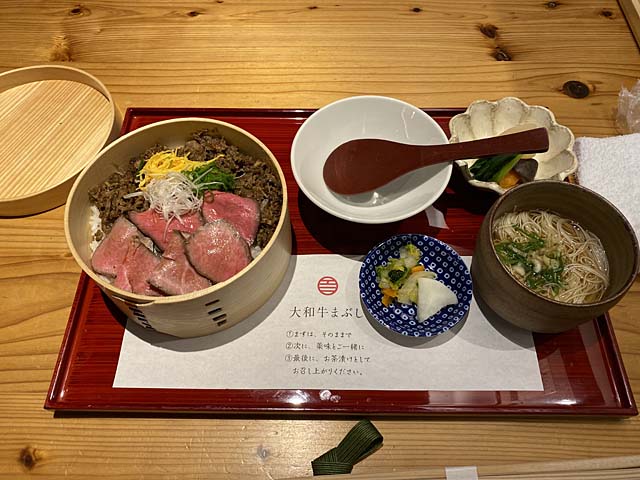 昨日お休みだったお店です。早めなので空いてます。一番人気の大和牛まぶし赤身たたきをいただきました。最初はそのまま、次は薬味で、最後はお茶漬けで。