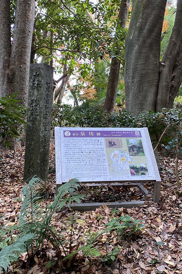 寛永の三筆とうたわれる松花堂昭乗の坊跡。明治の廃仏毀釈によって撤去された。松花堂弁当の由来は、松花堂昭乗が農家の種子入れだった器を小物入れとして使っていたのをヒントに吉兆の創業者がそれを弁当箱に利用したのが始まりとか。