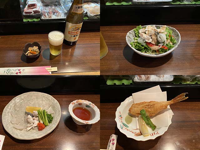 お通しとビール。まずはのどを潤わせます。上右)ふく皮サラダ、下左)とらふく刺、下右)小ふく唐揚。