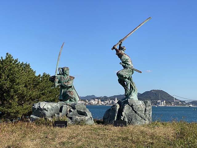 宮本武蔵と佐々木小次郎が決闘したとされる場所。元々島の名前は舟島です。佐々木小次郎は美剣士の若者とのイメージがありますがこれは吉川英治の小説「宮本武蔵」の影響でして。佐々木というのも史料には出てこないそうで。巌流小次郎という老剣士だったとか。まぁ、決闘した場所には間違いないようです。