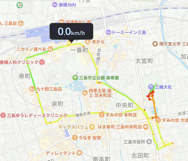 お参りして三島駅へ向かおうとすると、スマホが固定できない。ジョイントのロックが90度ずれている。この状態で到着した時なぜ外れた? 修正治具を持ってきていないのでスマホはポケットに入れて移動。この後、ペンチ等で修正を試みるも正常になることはなかった。なので、地図はもちろん、ログの記録も操作を忘れることも多くスマホのアプリとapplewatchのワークアウトを組み合わせて記録を残すことになってしまった。この後、何かと迷走しているのはこれの影響(;^ω^) ナビ多用により方向音痴になってしまったかな(--;;