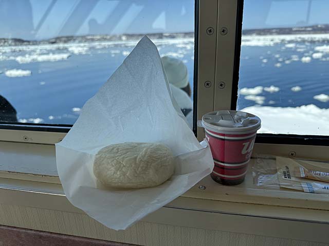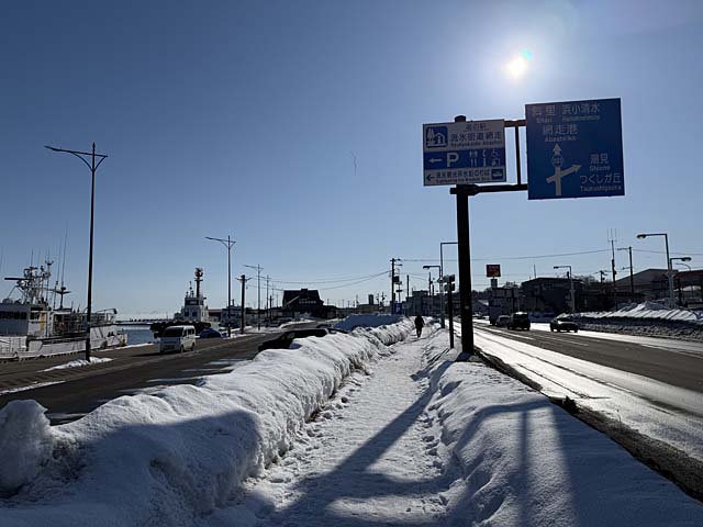 いよいよ流氷体験です。わくわくしますね。まずは小型船おーろら3の9時の1便狙い。予約していないので早め、というかかなり早く向かうので適当なバスがない。なので砕氷船乗り場までは歩いて向かいます。しかし、予約が少ないのか欠航に。仕方ないので9時半のおーろらに乗ることに。