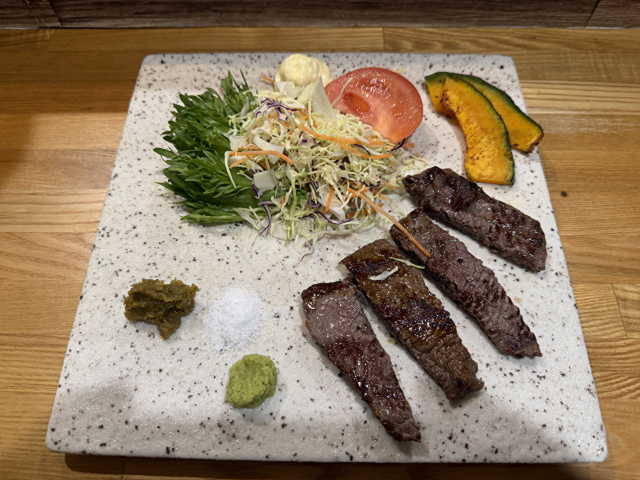 私にとっては夕食時間。お昼も軽く済ませてしまったので食べに出ます。とはいえ日曜日。やっている店も少なく、宿の近くで開いていた『鉄板焼 開夢』でいただくことに。