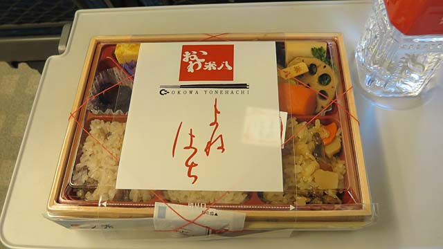 7時過ぎ、新横浜に着く前に用意してました。今回のお弁当は米八の幕の内です。