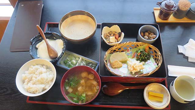 時間があまりありませんのですぐ出てくるという季節のご膳(1000円)をいただきました。伊勢芋のとろろ、寄せ豆腐、麦飯、煎り大豆、おからサラダ、旬野菜3品、みそ汁、漬物。メニューにはこのように書いてありますが一部違うかな? その時々でというのは当たり前ですので(^^)