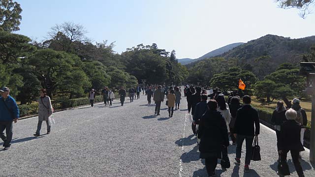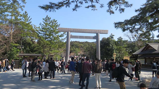 参拝が終わって御朱印をいただきに行きます。かなり混雑するという情報もあるしツアーの場合遅れるわけにはいかないので少し急ぎ足で御饌殿へ。御饌殿の曲がった側でいただけます。誰もいない? 空いてるじゃん(^^ゞ ここで抜けてました。参集殿にしかオリジナルの御朱印帳は取り扱ってないことを。参集殿は本来の参拝ルートからは外れたところにあります。帰りだったら通るかもしれないという行くときは気付きにくいですね。急ぎ足で行ってきます。戻ってみると団体さんが来たのか結構並んでます。見ていただければわかりますがシンプルなので思ったより早く頂けました(^^)