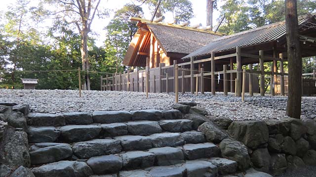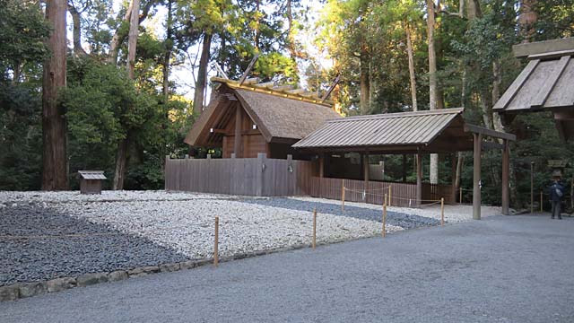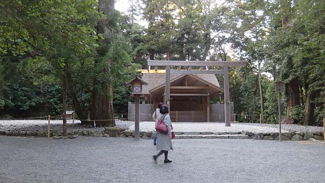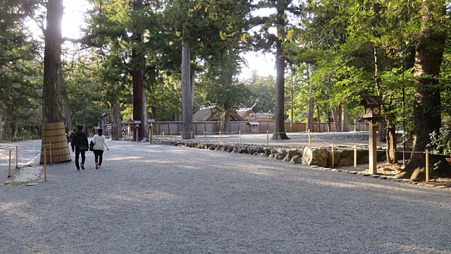 見えてきました。手前が古殿地です。式年遷宮する前まで神様を祀っていたところ。20年に一度お隣りへお引越しです。内宮の方では現在は手前におられるので奥の古殿地は見ることは出来ません。