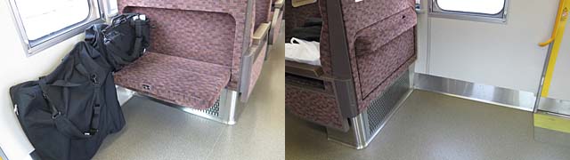 こちらの快速電車はボックスシート。ブラ君の居場所は混雑時は広く、車椅子やベビーカーはゆとりをもって居られる場所。そして補助シートがあるので空いてれば荷物の横で座ることも出来ます。で乗り換えも同じシートで少し早かったからかな両方座って来られました。
