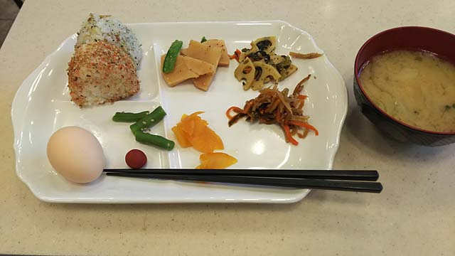 ホテル提供の無料の朝食。バイキング形式でおにぎり二個と。私にとっては十分です。