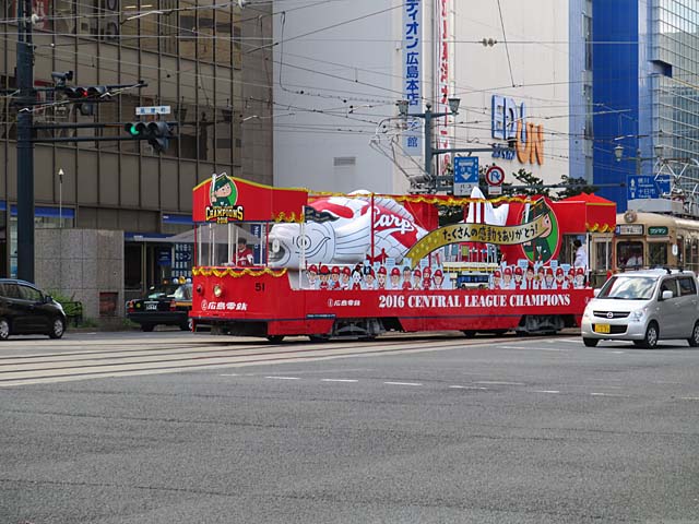 なにやら珍しい路面電車。カープ25年ぶりのリーグ優勝の感謝を込めて広電が走らせているようです。そりゃ珍しいよね、地元と思しき人たちも写真を撮ってました。実は気付いたときは真横にいてクリアに見られたのです。がカメラを取り出した時には… しばらく追っかけたけど見失ってしまった。