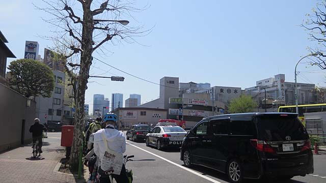 築地市場前、人車とも多く信号待ちのようですが自転車も渋滞を起こしてます。