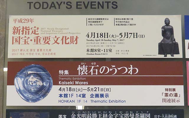 特別展だけではもったいないので他にも行ってみます。まずは『新指定国宝、重要文化財』新規に指定された国宝、重要文化財たち。価値は分かりませんが(^^ゞ それと、『茶の湯』と連動して企画されている『懐石のうつわ』 茶道具ばかりにスポットが当たっていますが器も捨てがたいです。漆塗りの素朴なものが主でした。(どこかの席で使われたとかだったように思いますが(^^;;)
