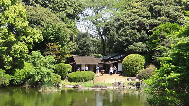 そして、春の庭園開放の期間中です。今回は庭園本館北側の庭園で茶室「転合庵」の内部を外から見ることができました。しばし散策。