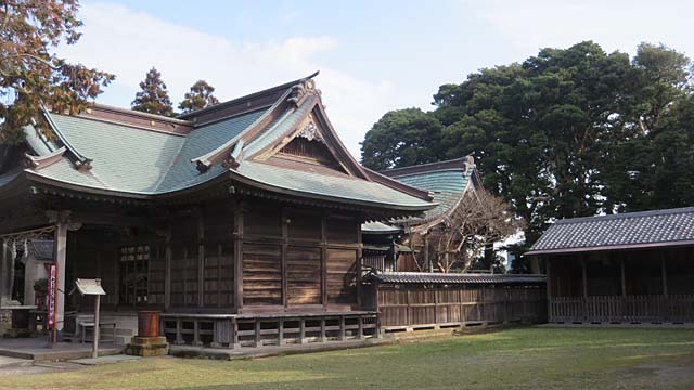 安房神社遥(よう)拝殿。神社にはよく伊勢神宮遥拝場というのがありますが、伊勢神宮がその方向のはるか先にあって拝めるように用意された場所なのですがこちらではこの土地の一宮である安房神社、しかも拝殿があるという信仰が厚いように思われます。ただ、こちらは総社。安房神社の祭神も分祀されて祀られているはずですが(^^?