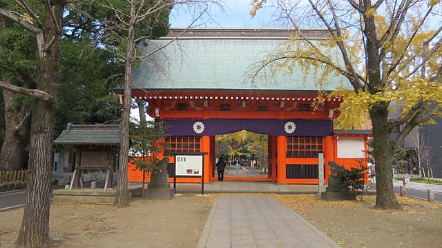 随神門。左右に右大臣、左大臣像。明治以降に移築されたもの。元々は寛永寺の末寺の仁王門だったそう。