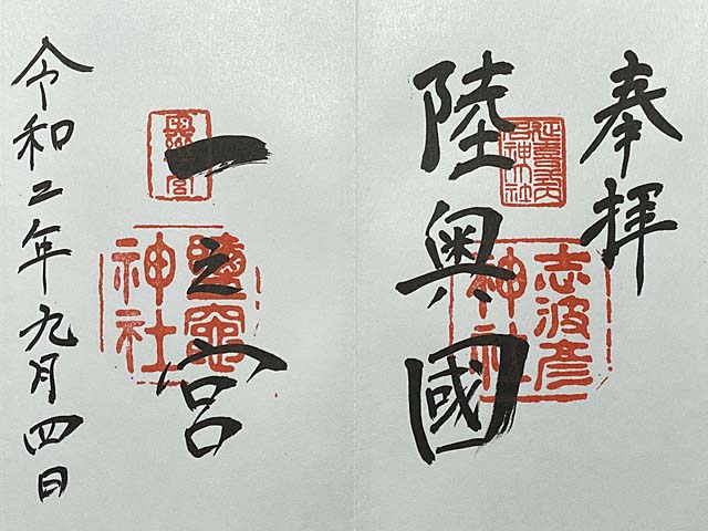 御朱印も左右宮拝殿と同じように見開き2面に書かれています。志波彦神社 鹽竈神社 両社500円となっているのですが各500円の1000円かと思ったら両社で500円でした。最初っからお釣りをいただいてしまいました(^^; お釣りがないように用意しているので(^^ゞ