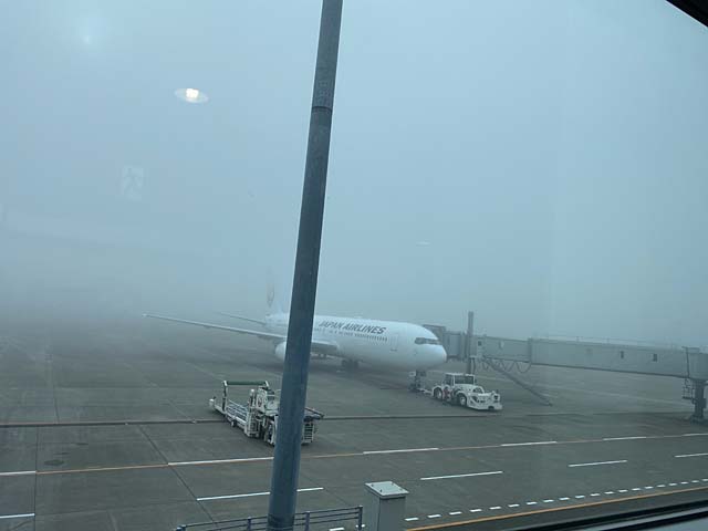 着陸した釧路空港。視界何メートルでしょうか。まだ誘導灯が目視できたから着陸したんでしょうね(推測です)