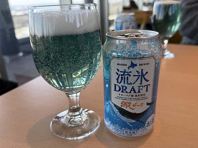 お昼の時間。2Fのレストラン ドルチェアクアで一緒に食事することに。流氷DRAFTビール。