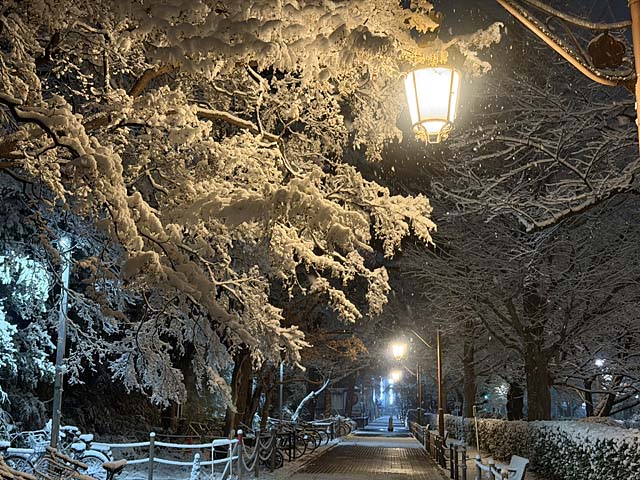 前日午後から降り出した雪。電車が止まるレベルではないものの時間は当てになりません。始発で東京駅へ向かいます。